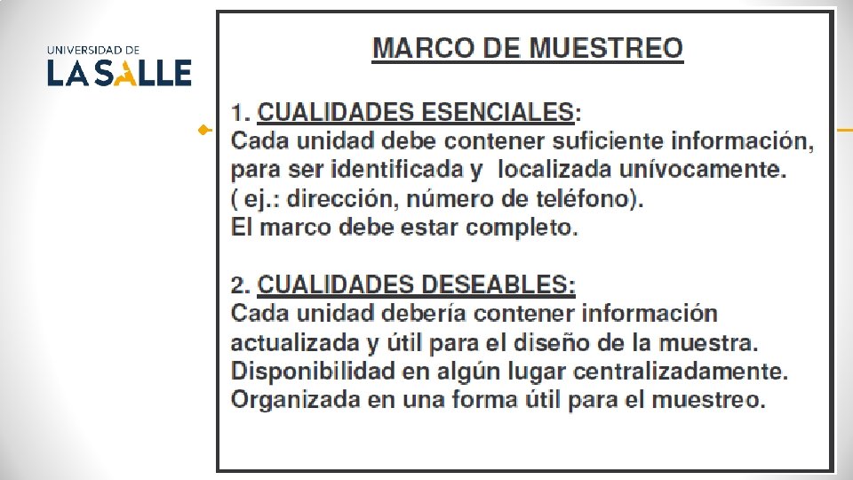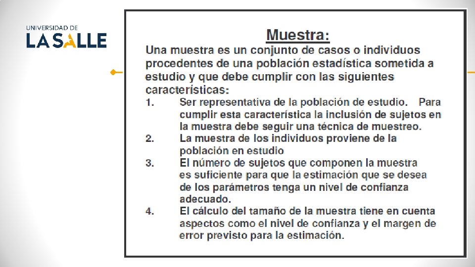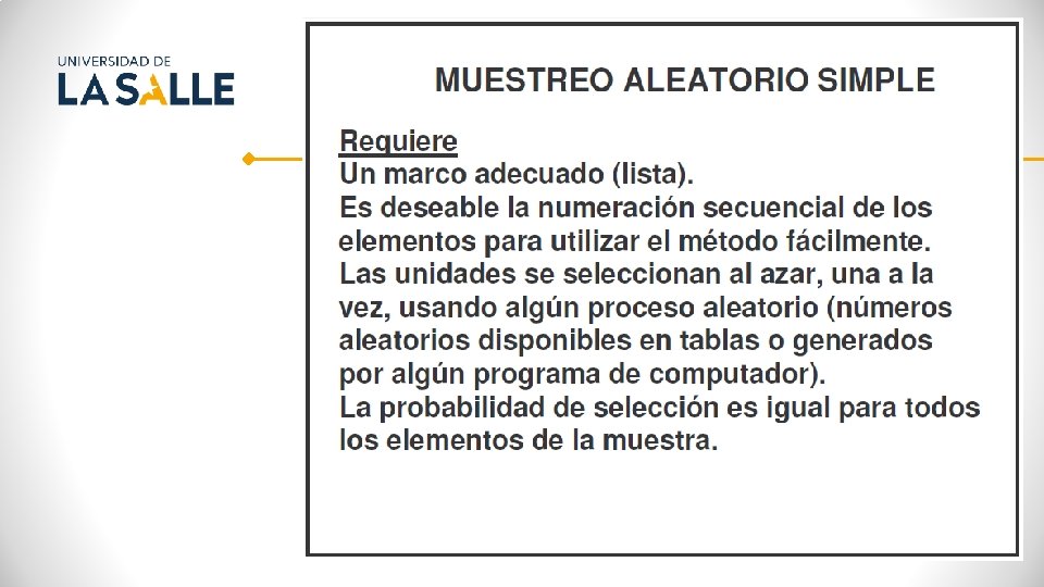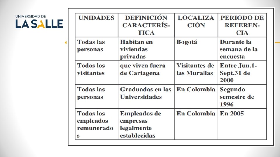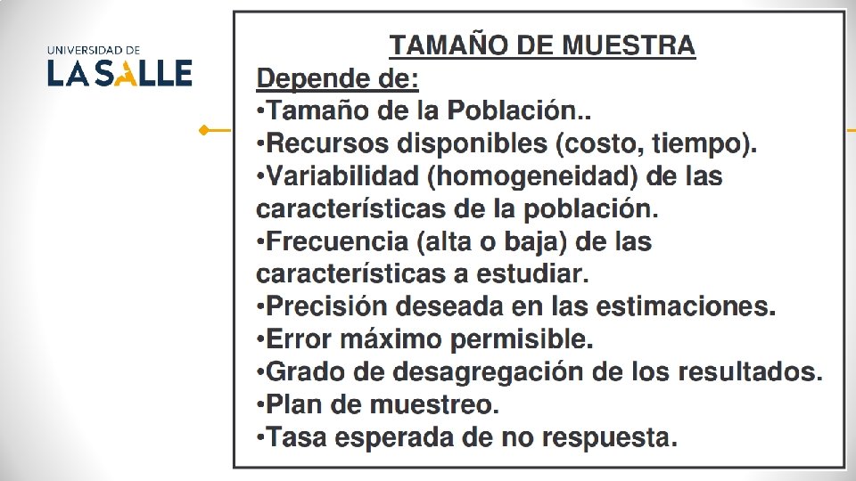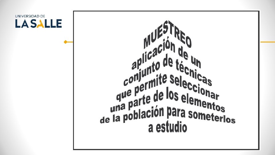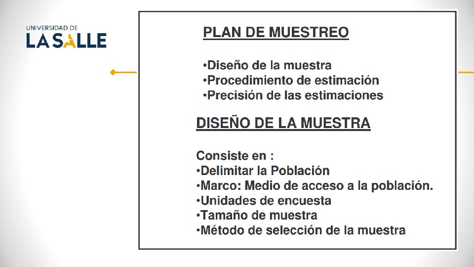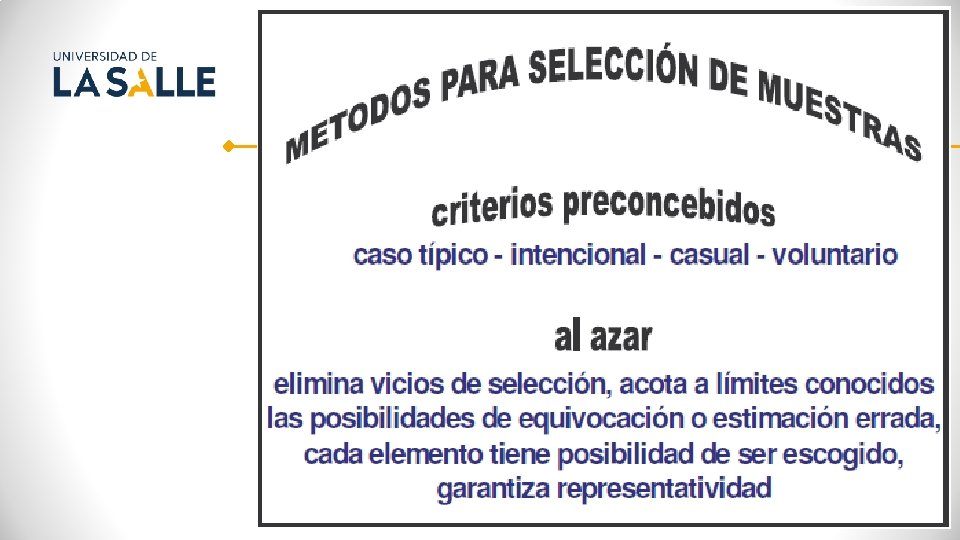 v Es el método estadístico por medio del cual se definen los criterios y técnicas que deben orientar el proceso de recolección u obtención de información”. v Es claro que el procedimiento de selección y el tamaño está cruzado por los objetivos de la investigación, las poblaciones son en lo general diferentes y por lo tanto, deberán utilizarse criterios distintos para seleccionar las unidades bajo estudio.