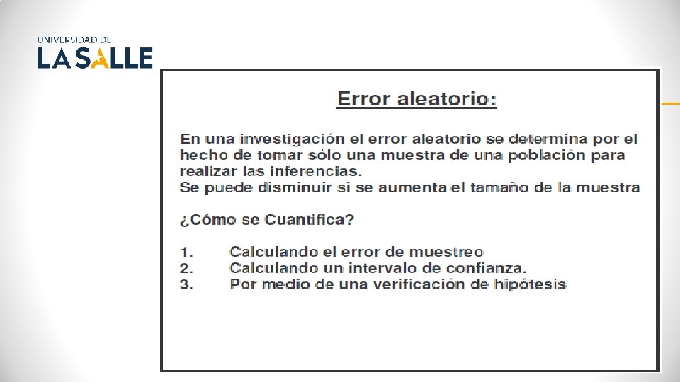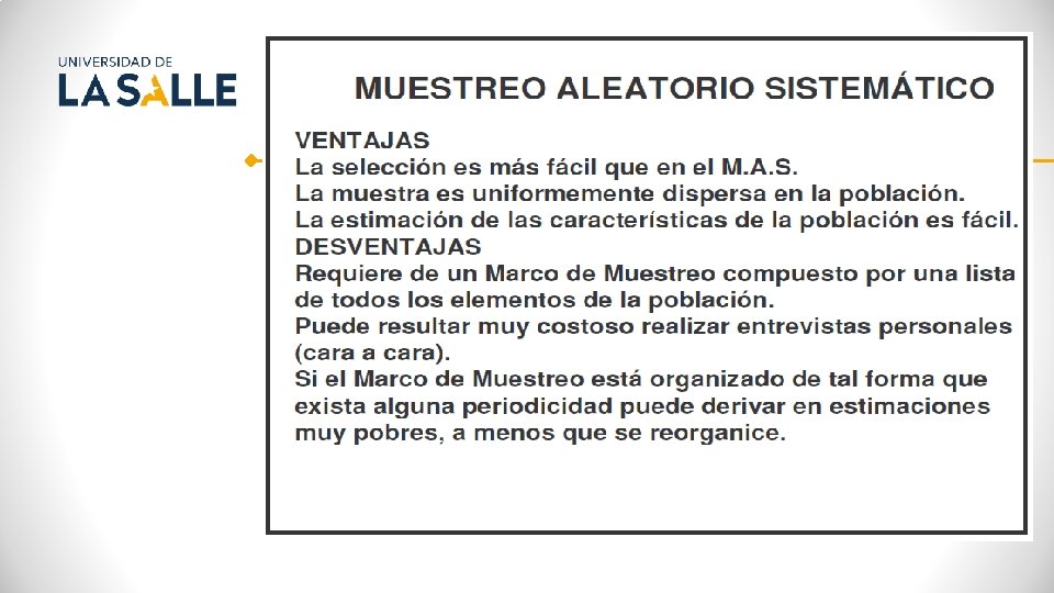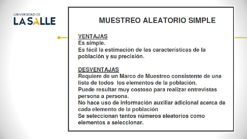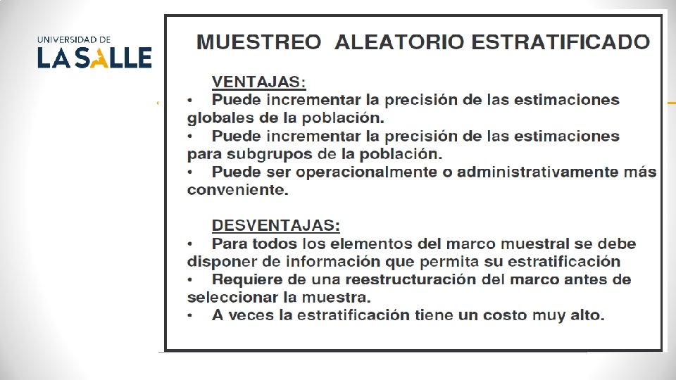 Ventajas del Azar Elimina la subjetividad de los investigadores en la selección de unidades de análisis Permite medir la precisión de las estimaciones. El azar no garantiza representatividad.