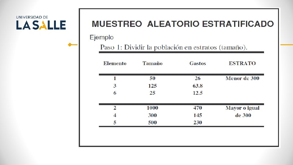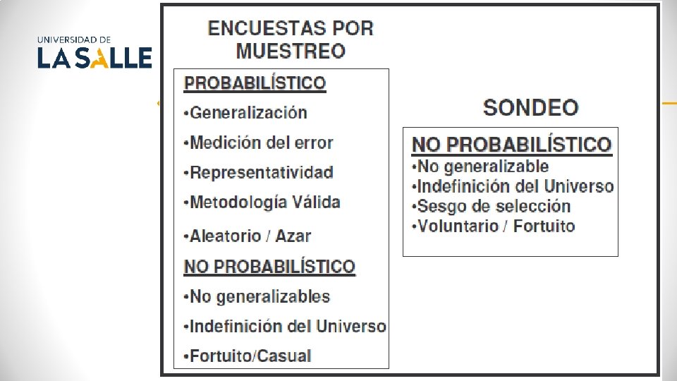 PROBABILISTICO (Probabilidad mayor de 0 y conocida). No PROBABILISTICO Conveniencia M. A. S Juicio SISTEMATICO Prorrateo (cuotas) ESTRATIFICADO Con fines especiales CONGLOMERADO Bola de nieve AREAS