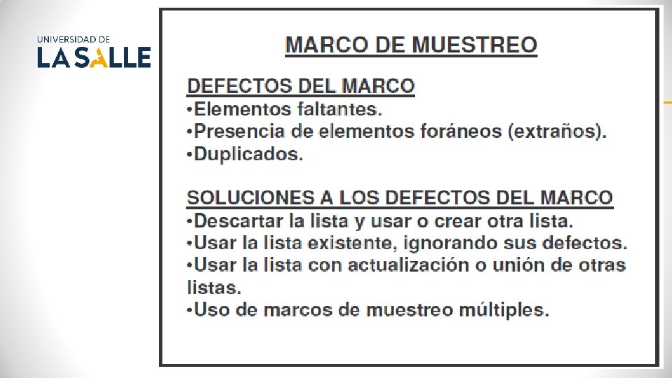 Los marcos muestrales pueden cometer 3 errores los cuales deben ser corregidos para evitar posibles sesgos en las estimaciones. Subcobertura: Ocurre cuando hacen falta elementos del universo en el marco muestral. Por tal motivo debe existir un mecanismo para que actualicé el marco muestral continuamente. Sobrecobertura: Ocurre cuando el marco esta desactualizado y algunos elementos ya no pertenecen al universo. Repetición: Ocurre cuando los elementos del universo están registrados varias veces, con el mismo nombre o identificación, en esta caso es fácil identificarlo, sin embargo ocurre que puede un elemento del universo estar presente con diferente identificador.