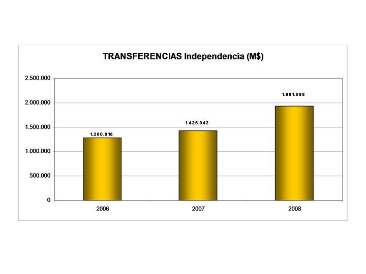 COMUNAS 2006 2007 Colina 2. 028. 536 2. 184. 930 2. 949. 337 Conchali 2. 921. 407 3. 370. 590 4. 776. 088 Huechuraba 1. 395. 405 1. 746. 064 2. 209. 491 Independencia 1. 280. 916 1. 425. 042 1. 881. 088 Lampa 1. 224. 601 1. 387. 534 1. 815. 905 Quilicura 2. 188. 764 2. 640. 331 3. 439. 884 Recoleta 2. 528. 602 2. 935. 536 3. 829. 032 309. 433 315. 075 390. 797 13. 877. 667 16. 005. 105 21. 291. 625 Til TOTAL 2008