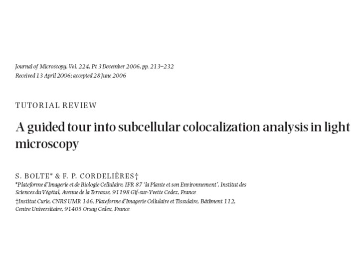 Introducción El análisis de colocalización por microscopía óptica está aquejado de ambigüedad e inconsistencia. Evaluación cualitativa simplista de pixeles sobrelapados Elección entre varias soluciones complejas basadas en análisis estadístico de distribuciones de intensidades de pixeles