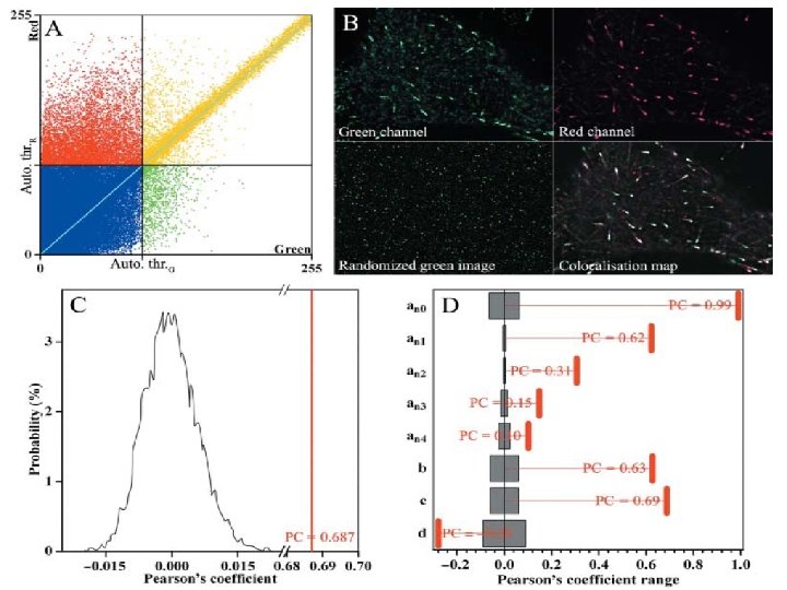 Aproximación de Costes 2. Análisis estadístico basado en aleatorización de la imagen y cálculo del nuevo coeficiente de correlación de Pearson. • Desordenan la imagen tomando como unidad partículas definidas como bloques de pixeles de dimensiones dadas por la FWHM de la PSF del canal verde. • Este proceso se repite 200 veces para cada imagen, calculan el PC cada vez. • La PC de la imagen original se compara con la distribución de las PC generadas aleatóreamente.