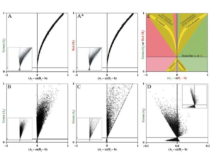 Problemas del coeficiente de Pearson • 1 Pobre discriminación entre colocalización parcial y exclusión, sobretodo en presencia de ruido (ie. sensible al umbral). 2 3 Colocalización total con ruido aleatorio progresivo.