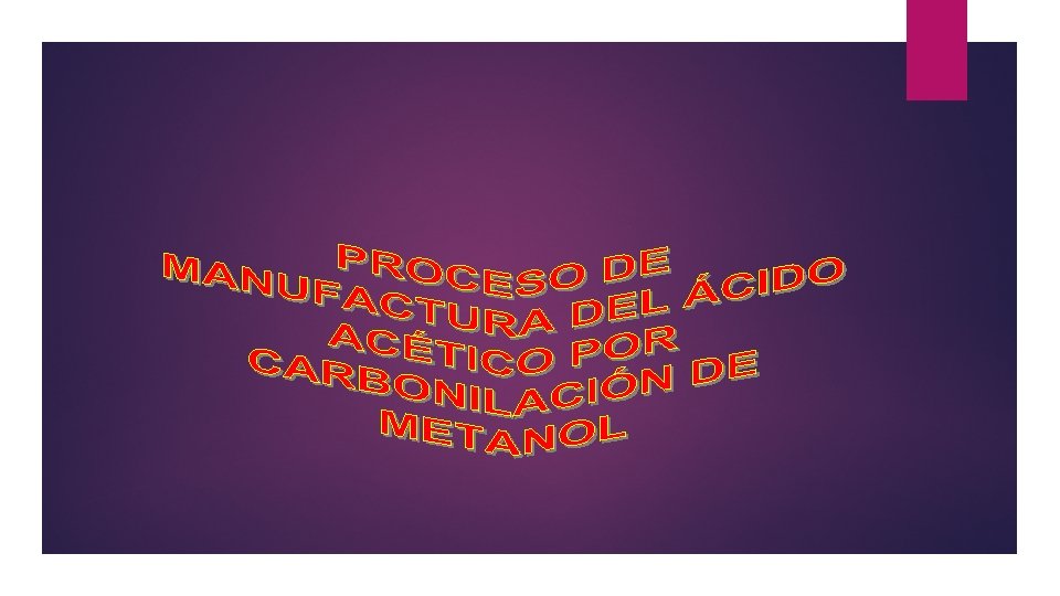 La reacción de carbonización de metanol al producto ácido acético puede llevarse a cabo por la puesta en con tacto íntima de la alimentación con metanol, que está en la fase líquida, con monóxido de carbono gaseoso borboteado a través de un medio líquido de reacción que contiene el catalizador de rodio, el componente activador de yoduro de metilo, acetato de metilo, y activador adicional de yoduro de litio. NOTA: en el sistema catalizador lo que es importante es el ion yoduro y no el catión asociado al yoduro. - El yoduro de litio está presente en la solución catalítica en proporciones desde 2 hasta aproximadamente 20 % en peso, el acetato de metilo está presente en proporciones desde 0, 5 hasta aproximadamente 30% en peso, preferiblemente a 25 % en peso, y el yoduro de metilo está presente en proporciones desde 5 hasta aproximadamente 20 % en peso. El catalizador de rodio está presente en proporciones de 200 -1000 ppm y preferiblemente de 300 -600 ppm.
