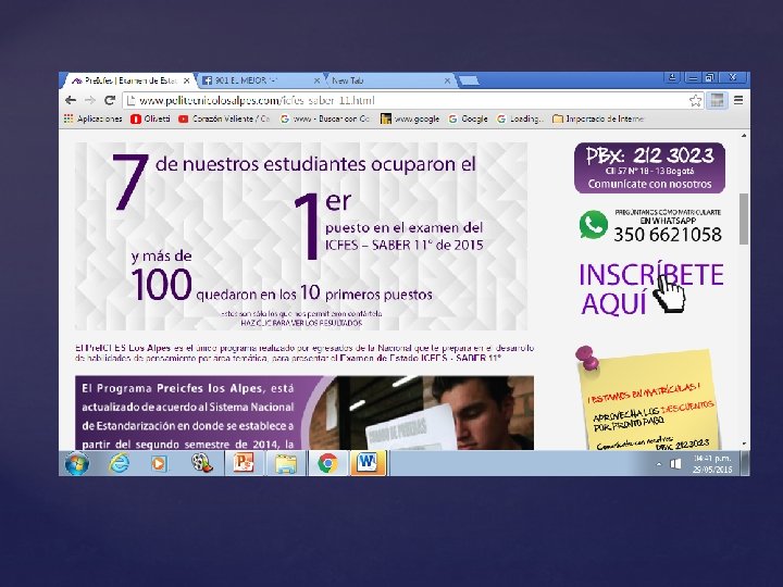 Además el Politécnico Los Alpes te ofrece sin costo: Seminarios de lunes a viernes y Tutorías los sábados, en temas del Examen de la Universidad Nacional y del Examen ICFESSaber 11°. Taller de Orientación Vocacional en tres sesiones dirigidas por Psicólogos El Taller de Manejo de Ansiedad y Estrés te brinda herramientas para que desarrolles técnicas de relajación para afrontar momentos de presión como es la presentación de un Examen. El Taller Hábitos de Estudio promueve y te brinda estrategias para optimizar tu desempeño y resultados académicos. En el Taller Conociendo el Examen de Estado ICFES - SABER 11°, conocerás la estructura del examen, número de sesiones, tipo de preguntas, consejos para presentar el examen. Dos Electivas: Análisis de Textos y Lógica.