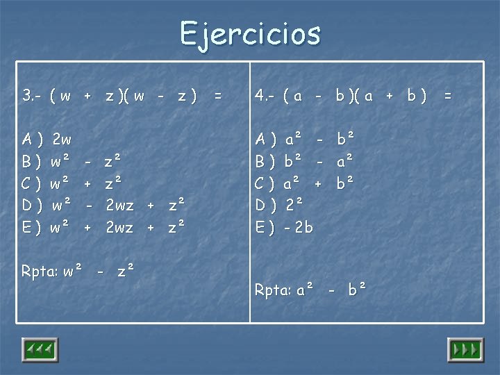 n Resolver: 7. (w + z)(w - z) w²+2 wz+z² w² - z² (w+z)²