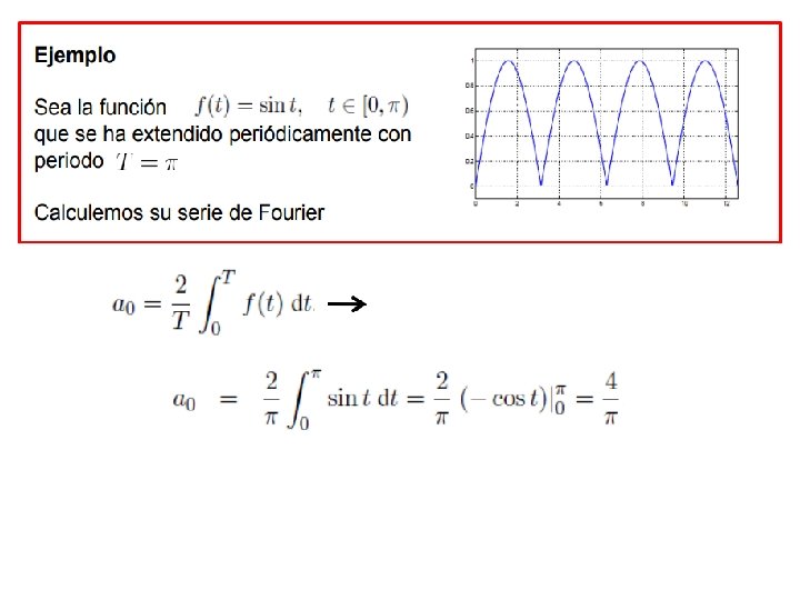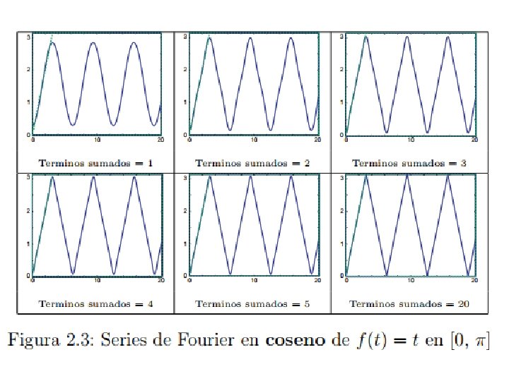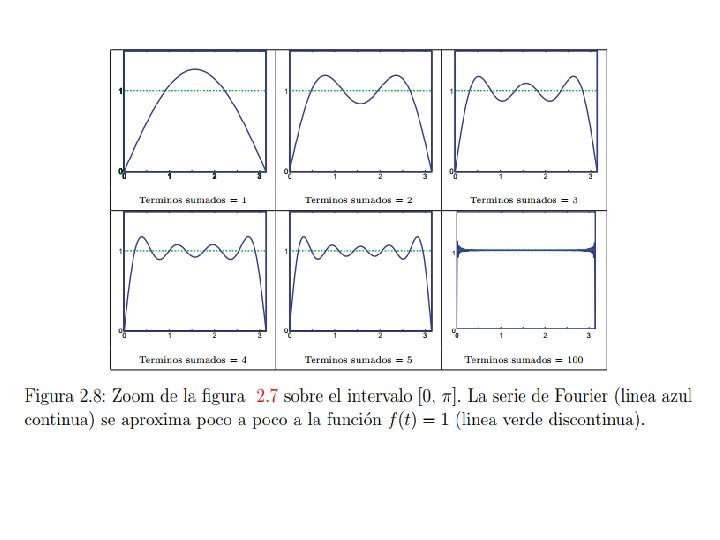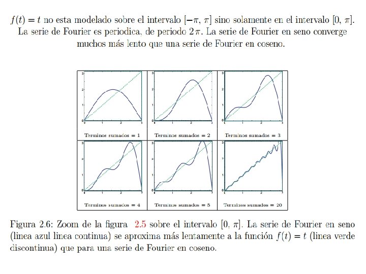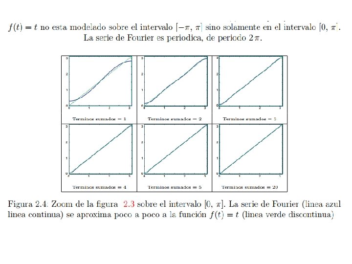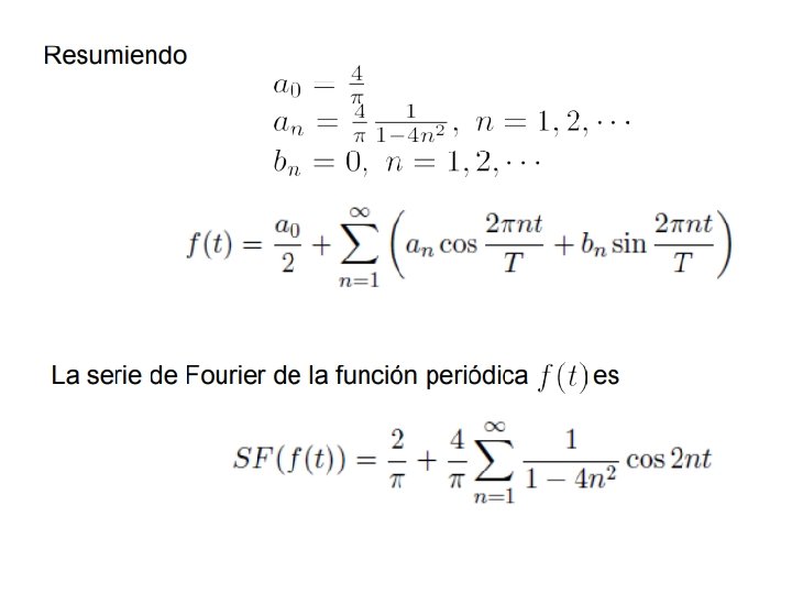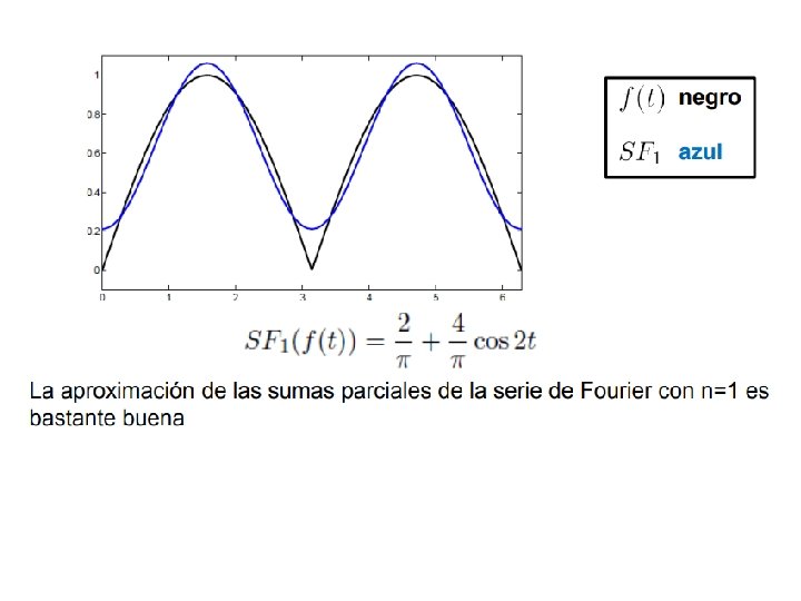 Aplicaciones a la aproximación ¿Qué significa la representación en serie de una función? Cualquier función periódica pueden representarse mediante una serie de funciones trigonométricas de frecuencias que son múltiplos enteros de la frecuencia fundamental de la señal dada. Esta serie es la denominada Serie de Fourier, que puede ser exponencial o trigonométrica. La serie converge el valor de la función, es decir, a medida que se suman más términos a la serie ésta es más “parecida” a la función que representa.