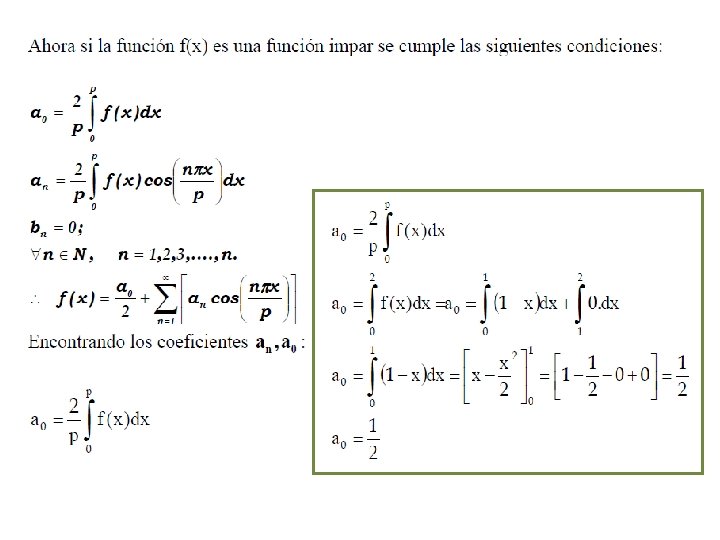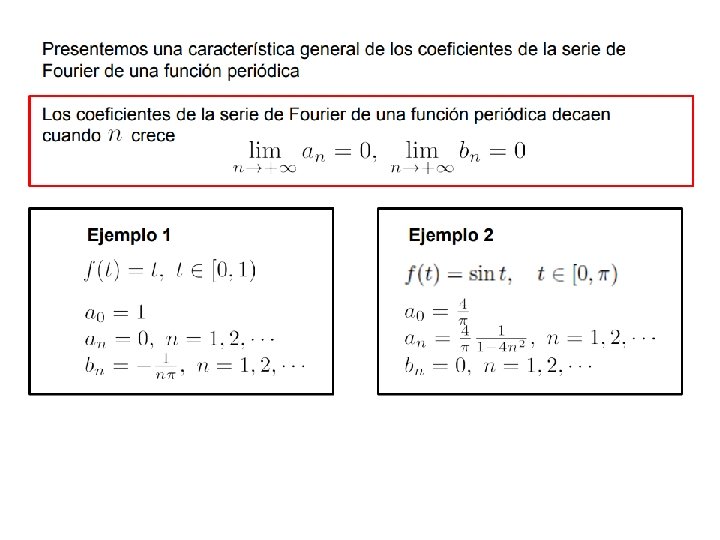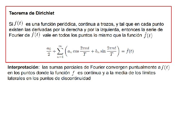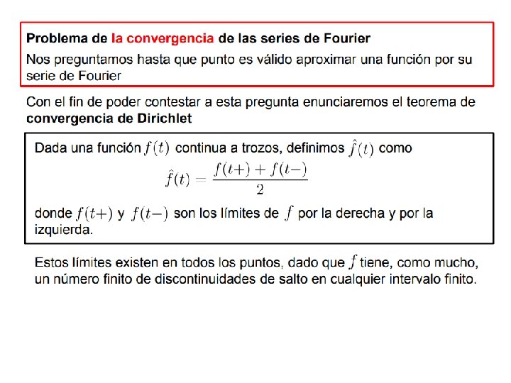 Las condiciones particulares que debe reunir una función f(t), a fin de que pueda representarse mediante una serie de Fourier, se conocen como condiciones de Dirichlet y son las siguientes: i. La función f(t) debe ser periódica; ii. La función debe ser continua, excepto (posiblemente) en un número finito de discontinuidades finitas; iii. La función debe tener solamente un número finito de máximos y mínimos dentro de un periodo. T; y iv. La integral de |f(t)| sobre un periodo T, debe ser convergente.