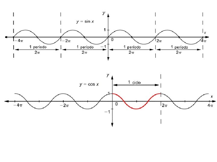 La función f(x) = sen (x) es periódica de periodo T=2π, ya que se cumple que: f(x) = f(x + K· 2π) para todo K ∈ Z. En efecto, sen(x) = sen(x + 2π) = sen(x + 4π) = sen(x + 6π) =. . . Además, sen(- x) = - sen(x) , por lo tanto es impar. F(x) = cos x = cos (x + 2π) = cos (x + 4π) = cos (x + 6π) =. . . es periódica, y es par. La función tangente tiene un periodo T = π, es decir: f(x) = tg x = tg (x + π) = tg (x + 2π) = tg (x + 3π) =. . .
