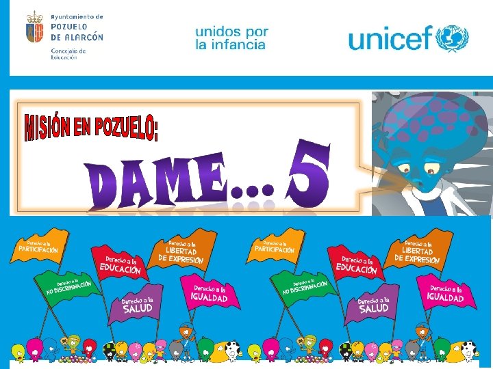 TAREA Con el fin de colaborar con los dos extraterrestres, Cede 54 y Ene 89, en la MISIÓN POZUELO: “DAME 5” debéis hacer un cómic en el que se incluirán los 5 DERECHOS DE LA INFANCIA que, para vosotros, sean los más importantes Para realizar el trabajo final buscaréis información acerca de aspectos relacionados con esos derechos imprescindibles e inviolables que han de satisfacer las necesidades de todos los niños y niñas. En el Proceso se os dan las pautas para conseguir vuestro objetivo. Una vez finalizado tu trabajo no olvidéis enviaréis vuestro cómic a la siguiente dirección de correo electrónico: ENVIAD UN MAIL A LA: CONCEJALÍA DE EDUCACIÓN ASUNTO: CÓMIC “MISIÓN DAME 5” INDICAD: Nombre del colegio, participantes y curso