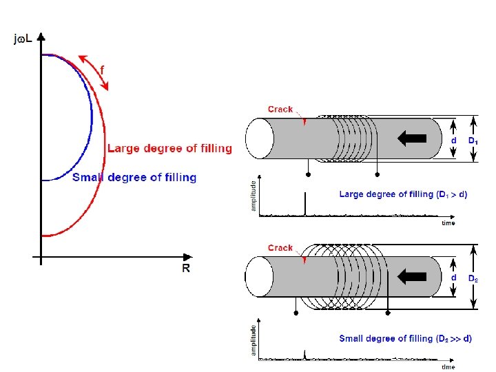 Sistema de bobina para inspección de elementos cilíndricos (throughput o encircling coil) La influencia de la separación entre el material y la bobina (caso de la bobina de exploración) se corresponde con el grado de llenado (encircling coil). Grado de llenado: relación entre la sección transversal de material de prueba respecto al de la bobina: factor de llenado bajo o de llenado alto
