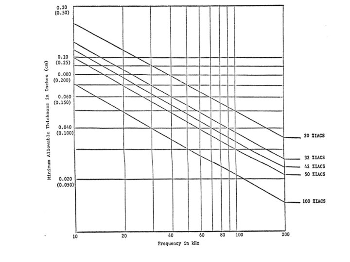 Conductividad eléctrica Su valor está referido o expresados en porcentaje de IACS (International Anneled Copper Standard) Los equipos están calibrados en % IACS. Por ejemplo para aleación de aluminio (30 a 40% IACS), dimensiones de fisuras entre 1, 52 a 3, 4 mm de largo y 0, 48 mm a 2, 48 mm de profundidad, se recomiendan frecuencias de inspección entre 100 y 500 k. Hz.