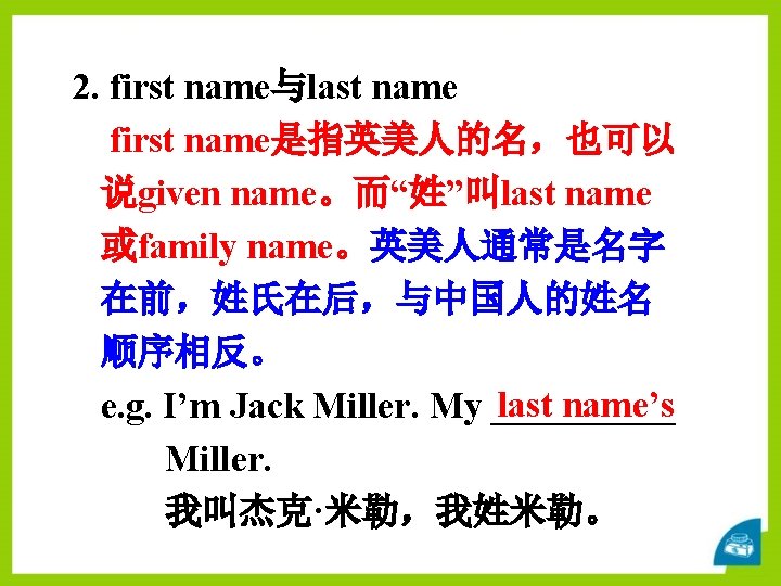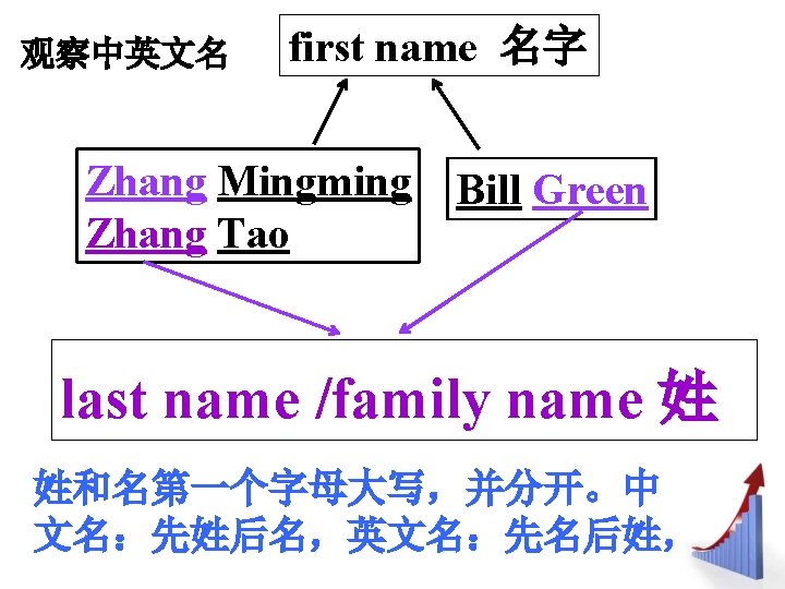 I’m Zhang Tao. My first name is Tao. My last name is Zhang. I’m Bill Green. My first name is Bill. My family name is Green.
