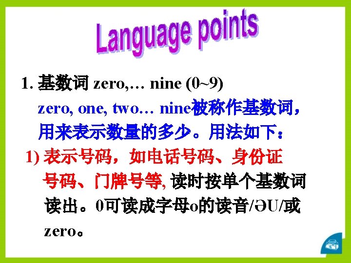 1 a Listen and repeat. 0 zero 2 two 1 one 4 four 6 six 3 three 5 five 8 eight 7 seven 9 nine
