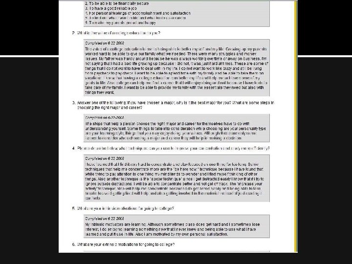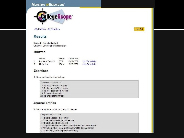 Journal entries provide the opportunity to think about the material and apply it to your personal life. They are generally a well-developed paragraph. The journal entries become part of your portfolio visible to you and your instructor.
