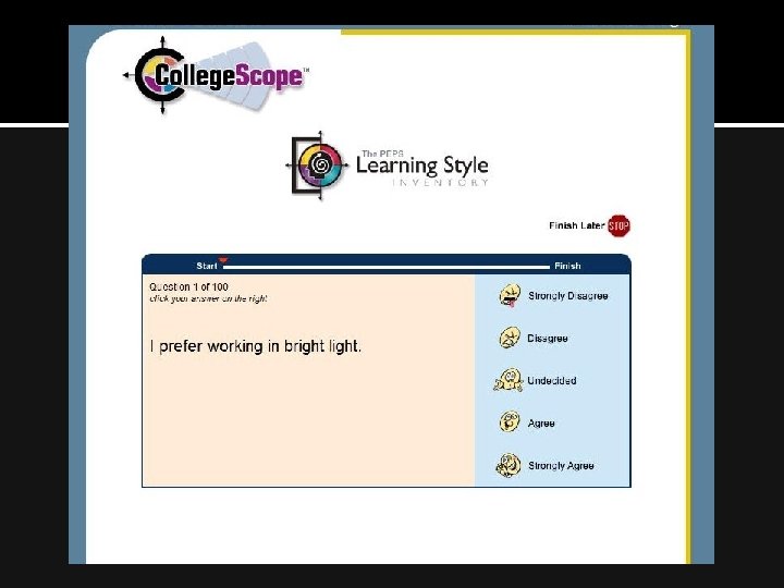 The Content Survey There are 100 easy questions. Just answer quickly. You can click on Finish Later if you don’t complete the survey all at once.