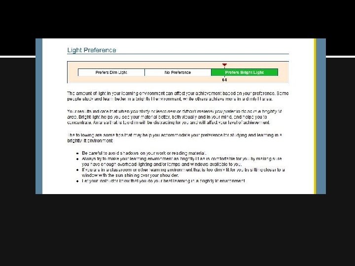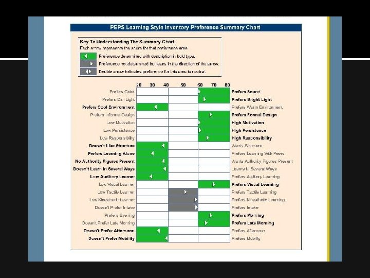 The Productivity Environmental Preference Survey (PEPS) measures: Preferences in 20 areas Learning style Productivity Best environment for learning and work