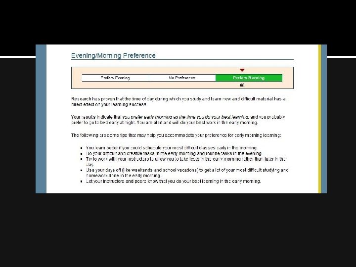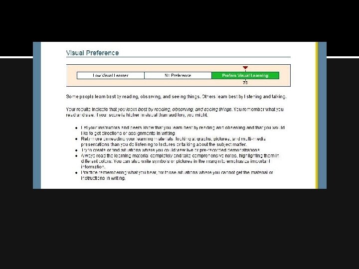 Important Considerations It is not a test It describes how you prefer to learn new or difficult material Usually there are 6 or 7 areas out of 20 that are important for an individual.