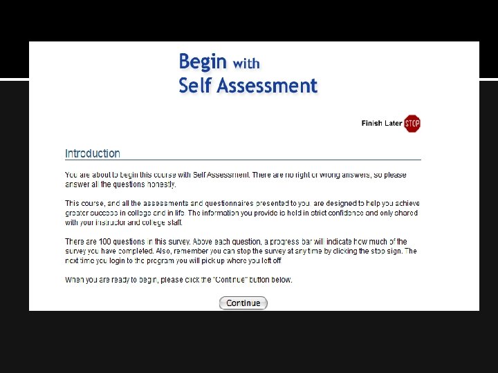 Start with an assessment The assessment is a pre-test to measure your skills at the present time. You will take this assessment again at the end to see how you have improved. Relax and answer the questions honestly. The assessment is a good outline of the content of College. Scope.