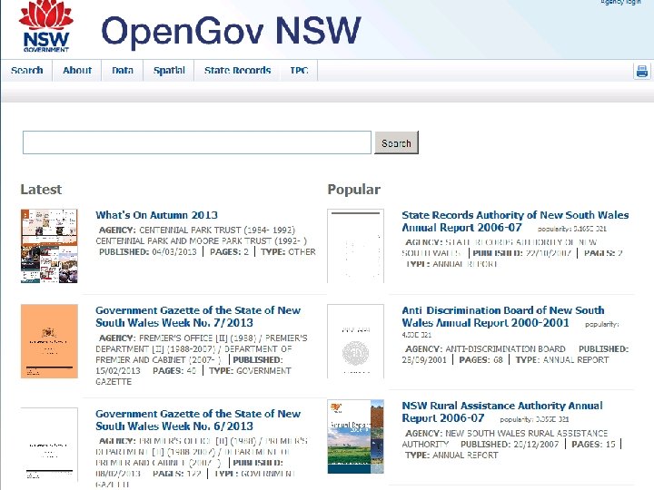 Open. Gov NSW • • • a searchable online repository for information published by NSW Government agencies, including Annual Reports, other publications and open access information released under the Government Information (Public Access) Act 2009 (GIPA Act). both contemporary and historical currently over 2000 titles, including: § a complete set of Government Gazettes 2001 -2013 § 19 th and early 20 th century digitised Annual Reports for Public Works, Police § Child Welfare Department Annual Reports mid 20 th century § lots of current content; 2011 -12 annual reports and plans