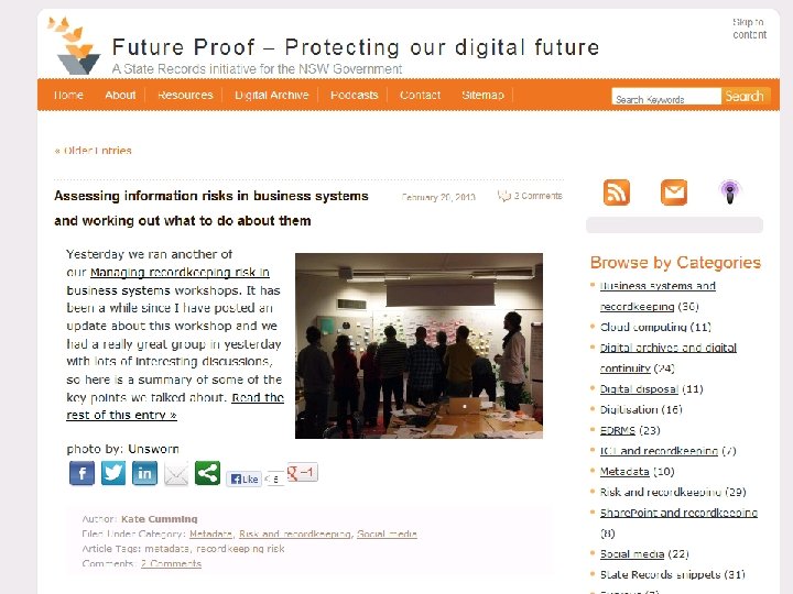 Digital archives • State Records’ Future Proof strategy seeks to ensure that: § the New South Wales government documents its business via the creation of robust, useable and trustworthy digital records § digital records are created and maintained in environments that have been adequately assessed and treated for risks § people and government have ready access to digital records documenting the business and memory of the State of NSW, and § the State’s digital archives are protected, preserved and accessible. • Through our Digital Archives project we have established the infrastructure and expertise to keep digital information usable and trustworthy in the long term