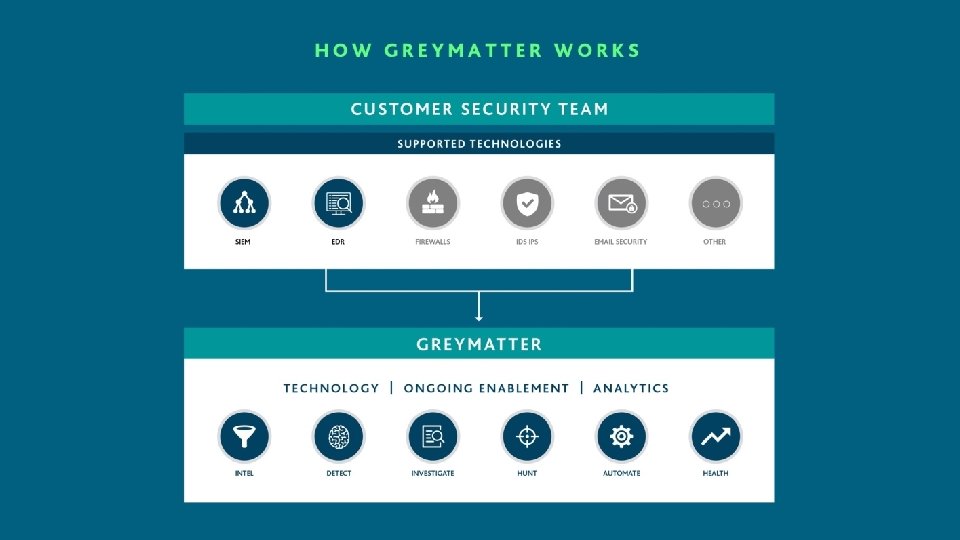 WHAT IS A PRIMARY A technology supported by all capabilities of the Grey. Matter Solution TECHNOLGY? EXAMPL ES: CUSTOMER SECURITY TEAM SIEM: Splunk, QRadar, Log. Rhythm, Mc. Afee, Arc. Sight SUPPORTED TECHNOLGIES PRIMARY SECONDARY EDR: Carbon Black, Crowdstrike, Cylance SIEM EDR FIREWALLS IDS/IPS EMAIL SECURITY OTHER