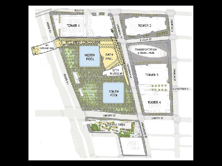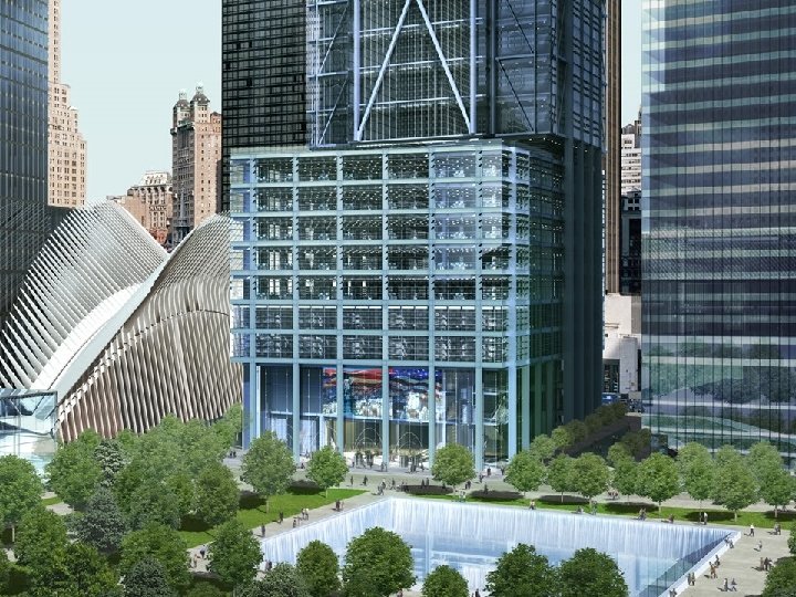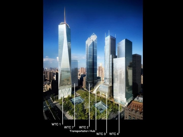THE NEW WORLD TRADE CENTER (WTC) COMPLEX OCCUPIES 16 ACRES; CONSISTS OF FIVE BUILDINGS NAMED BY THEIR NUMBER, A MUSEUM, A MEMORIAL, A TRANSIT HUB AND A MALL.
