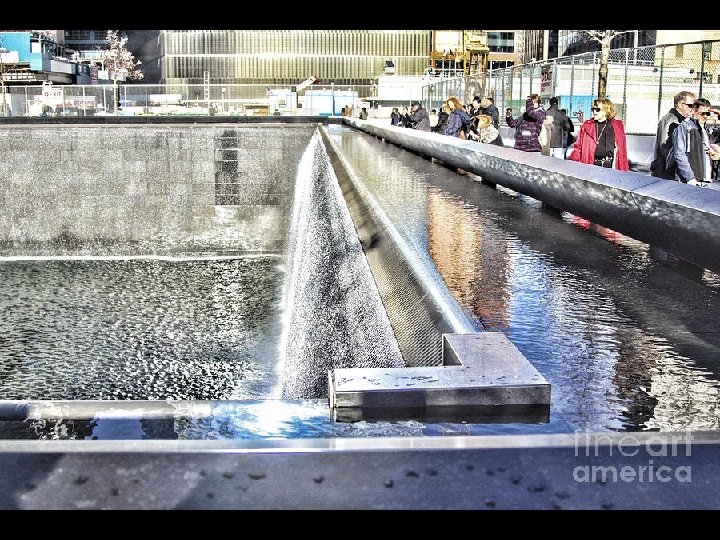 Water cascades down the sides and disappears into a second recessed area, the bottoms of which cannot be seen from the plaza. .