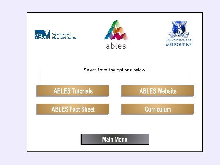 Resources • Victorian Curriculum site - Diversity of Learners tab including pre-intentional to intentional definitions http: //victoriancurriculum. vcaa. vic. edu. au/overview/diversity-oflearners • Aus. VELS Students with Disabilities Guidelines http: //ausvels. vcaa. vic. edu. au/static/docs/Aus. VELS-SWDguidelines. pdf • ABLES http: //www. education. vic. gov. au/school/teachers/teachingresources /diversity/Pages/ables. aspx