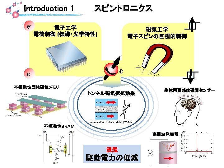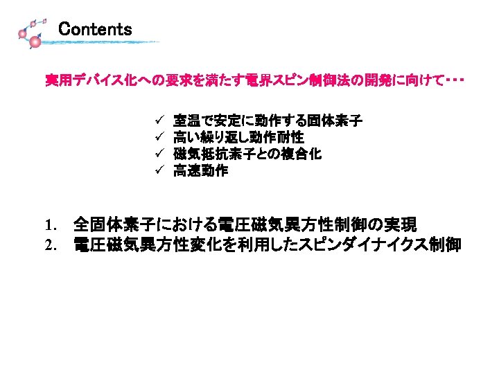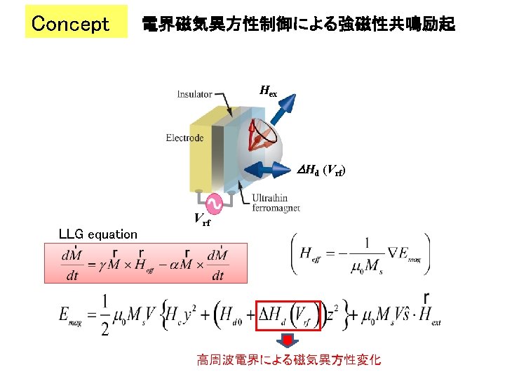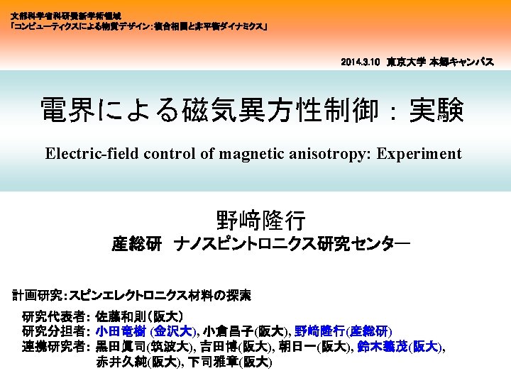 Summary • • • 全固体素子(トンネル磁気抵抗素子)における電界磁気異方性を実現 電界による高速スピンダイナミクス(強磁性共鳴)励起を実証 電界パルスを用いたダイナミック磁化反転を実証 Voltage control of magnetic anisotropy Voltage-driven MRAM Voltage-driven three terminal device (Spin transistor) Highly-sensitive detector Voltage-induced spin wave excitation