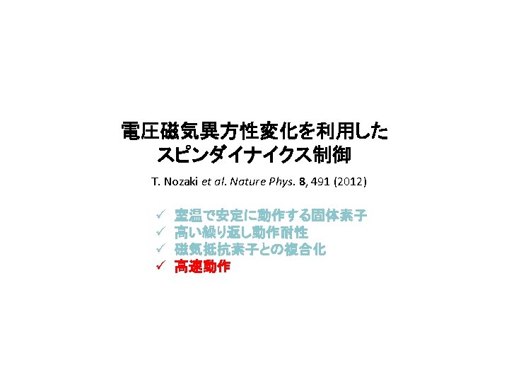 全固体素子における電圧磁気異方性制御の実現 T. Maruyama, Y. Shiota, T. N. et al. Nature Nanotech. 4, 158 (2009) Y. Shiota, T. N. et al. Appl. Phys. Exp. 2, 063001 (2009) T. Nozaki et al. APL. 96, 022506 (2010) Y. Shiota, T. N. et al. APEX 4, 043005 (2011) ü ü 室温で安定に動作する固体素子 高い繰り返し動作耐性 磁気抵抗素子との複合化 高速動作