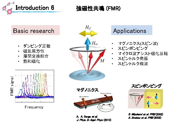 Introduction 5 垂直磁気異方性の起源 1. 3 d-白金族合金の結晶磁気異方性 L 10 -Fe(Co)Pt, Fe(Co)Pd 白金族系の強いスピン-軌道相互作用を活用 2. 界面誘起の垂直磁気異方性 Mg. O/3 d遷移金属界面 Fe/Mg. O ; T. Shinjo et al. J. de Physique 40, C 2 -86 -87 (1979). Co. Fe. B / Mg. O ; Ikeda et. al. Mature Mater. 9, 721 (2010). L 10 ordered Fe. Pt Ikeda et. al. Mature Mater. 9, 721 (2010) z 2 (m=0) Fe Mg O Mg. O 弱いFe dz 2 - O pz混成 ⇒ 垂直磁気異方性