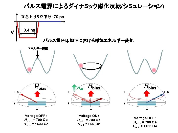 Macro-spin mode simulation z <LLG equation> x y Magnetic energy: 1600 1400 Hperp (Oe) From experiment; Ms = 1. 54 T Hc(0 K) = 25 Oe Hshift = 75 Oe Hperp (0 V) = 1400 Oe Hperp (-0. 75 V) = 600 Oe T = 300 K Parameter; a = 0. 01 1200 1000 800 600 400 -0. 75 -0. 25 0 0. 25 DC bias voltage (V)