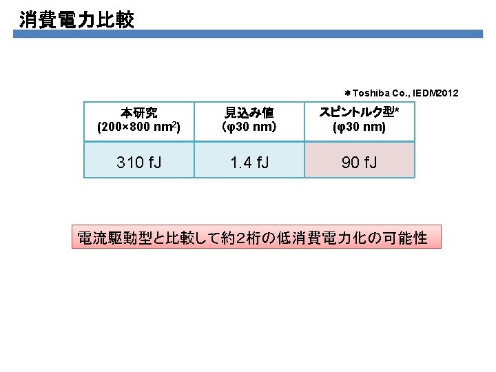 Comparison of the power consumption Spin torque induced FMR Cf. S. Ishibashi et al. Appl. Phys. Express, 3, 073001 (2010) Co. Fe. B / Mg. O / Co. Fe. B MTJ 100× 150 nm 2 RA: 2 Wmm 2, MR: 100% Precession angle: 1 deg. Consumed power: 1 m. W Voltage-field induced FMR Assuming the sample size… Precession angle : 1 deg. Consumed power: 0. 005 m. W Power reduction of 1/200!