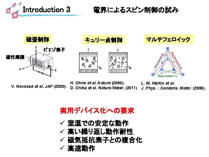 電界磁気異方性制御 Introduction 4 M. Weisheit et al. Science 315, 349 (2007) Pt Pt Fe. Pt Mg. O Electric double layer Electrolyte 1. 0 V -0. 12 -0. 11 H (T) -0. 1 0 H (T) 0. 1 Kerr rotation 0. 4 V 液体電界質による電気2重層の利用 4. 5%の保磁力変化 室温において、3 d遷移金属の垂直磁気異方性を 電界で制御することが可能!