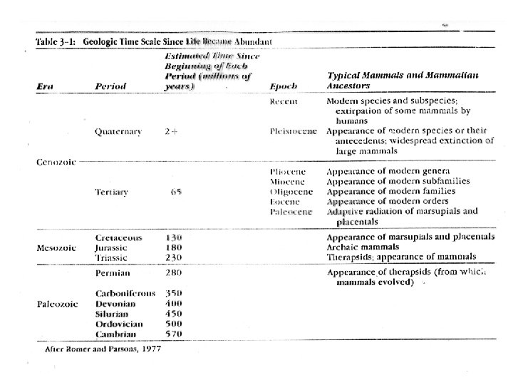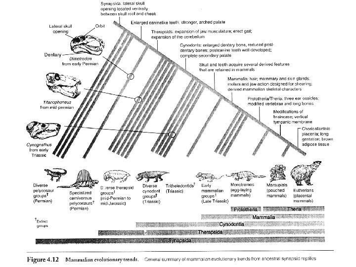Synapsida • Dominated terrestrial faunas during Permian and early Triassic • Many synapsid groups went extinct during Permian extinction event • Therapsida survived – Gave rise to cynodonts – Later, otherapsids dwindle • Mammals arose from cynodont ancestor in late Triassic