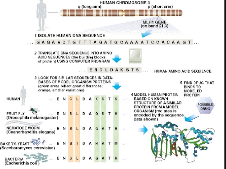 Steps in Post-Genomics Transcriptomics large-scale analysis of messenger RNAs; when, where, and under what conditions genes are expressed. Proteomics study of protein expression in time and space, more important than gene expression studies to whats actually happening in the cell. Structural genomics 3 -D structures of one or more proteins from each protein family, clues to function and biological targets for drug design. Knockout studies experimental method for understanding the function of DNA sequences and the proteins they encode. Inactivate genes in living organisms and monitor any changes, reveal the function of specific genes. Majority of knockouts do not give null phenotype. Comparative genomics DNA sequence patterns of humans and well-studied model organisms, most powerful strategies for identifying human genes and interpreting their function.