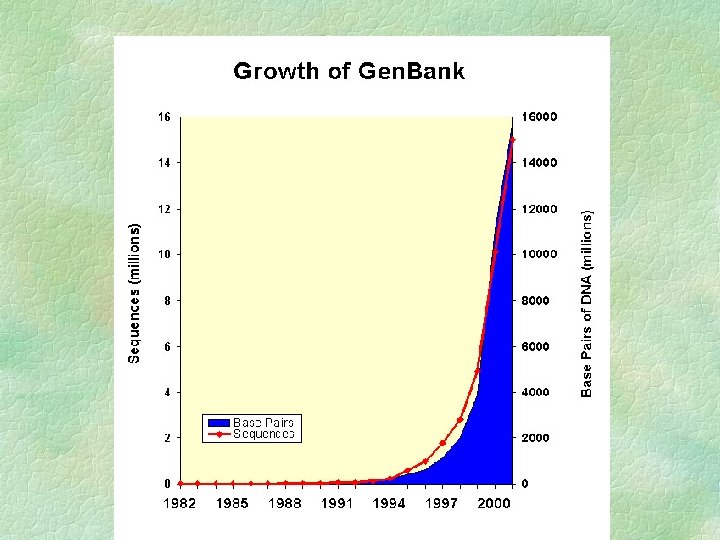 Brief History § 1953: DNA structure discovered § § § § § 1960 Assembly of protein sequence database - PIR 1977: Sanger sequencing technique developed 1979 Gen. Bank prototype was conceived 1980 EMBL database was founded 1988: Human Genome project initiated 1993 The first genome database ACEDB (C. elegans) 1995: Influenza genome sequenced (5 Mb) 1998: High throughput sequencing machine developed by PE Biosystems 2000: Drosophila genome sequenced (180 Mb) 2001: Human genome rough draft (2. 91 Bb)