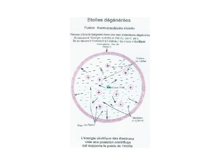 Paradoxe du fonctionnement des étoiles • Alors que la plupart de la matière se dilate lorsque sa température augmente, pour les étoiles, c’est exactement le contraire, elles se contractent. • Exemple: une protoétoile d’une masse égale à celle du Soleil a un rayon de 60 x 106 km et une température de 105 K. Ensuite, elle se contracte, son cœur atteint 107 K et la fusion thermonucléaire s’amorce, la température peut atteindre jusqu’à 109 K tandis que son rayon s’écroule jusqu’à 5000 km En dernier lieu, elle est soutenu par un gaz de Fermi dont température est quasi nulle !