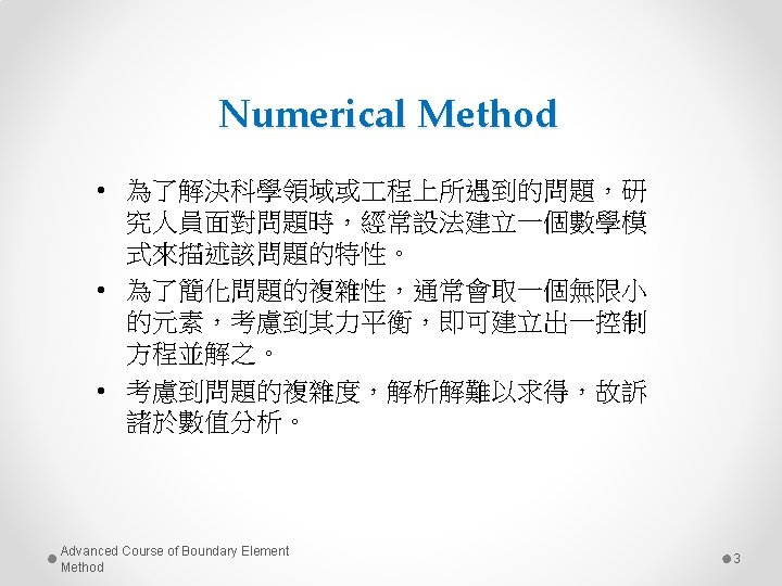 Numerical Methods Mesh Methods Finite Difference Method Difference Equation Finite Element Method PDE- variational Meshless Methods Boundary Element Method Integral Equation Null-BIEM Degenerate kernels MFS Trefftz Method Advanced Course of Boundary Element Method 4