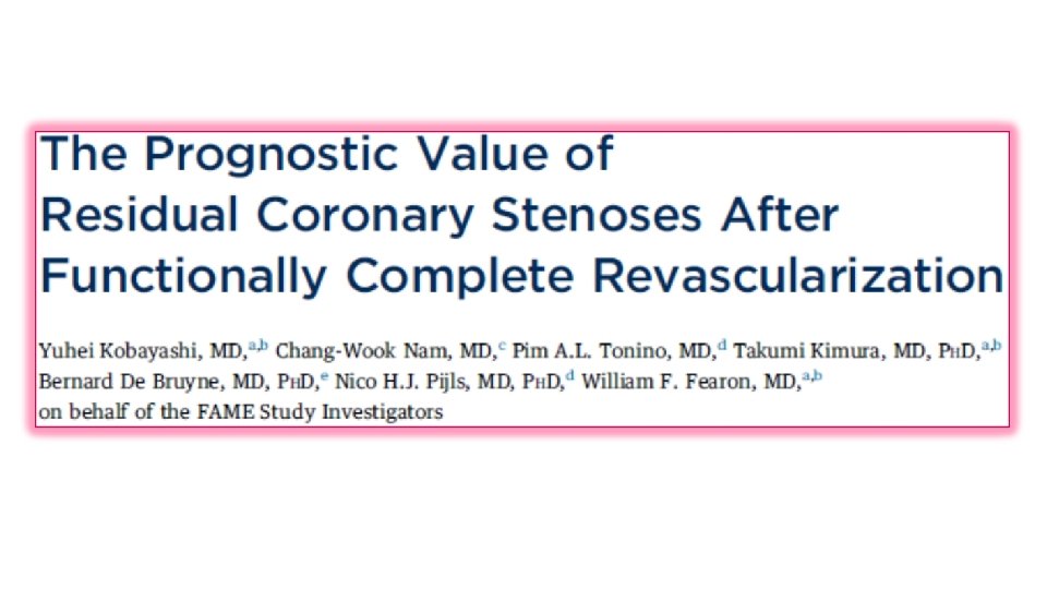 Conclusions • After functionally complete revascularization with FFR guidance, the residual functionally insignificant lesions do not increase the risk for MACE • Angiography-based RSS and SRI do not predict a worse long-term outcome in these patients • Supports the concept of functionally complete revascularization, rather than angiographically complete revascularization
