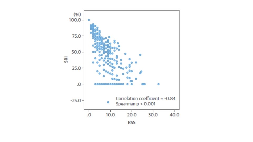 finding that the SRI positively correlated with the FSS explains that the SRI had no prognostic value because the SRI should be negatively correlated with the FSS to be prognostic