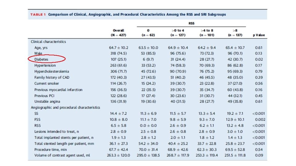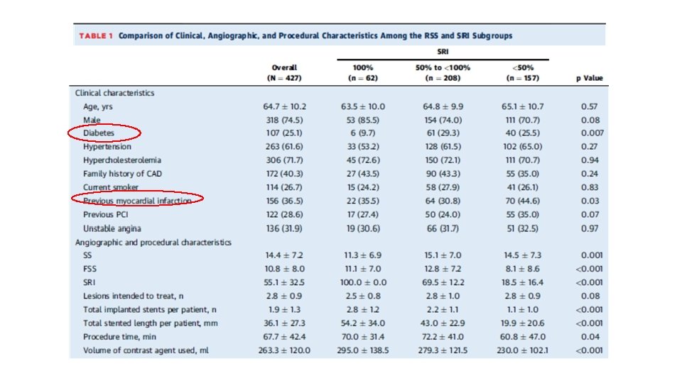 COMPARISONS OF BASELINE DATA AMONG THE RSS AND SRI SUBGROUPS • Baseline patient clinical characteristics were similar among the RSS and SRI subgroups • Except for • Diabetes in the RSS and SRI subgroups (p 0. 02 and p 0. 007) • History of myocardial infarction in the SRI subgroups (p 0. 03) • Diabetes was lowest in patients with RSS 0 and SRI 100%, which represents angiographically complete revascularization