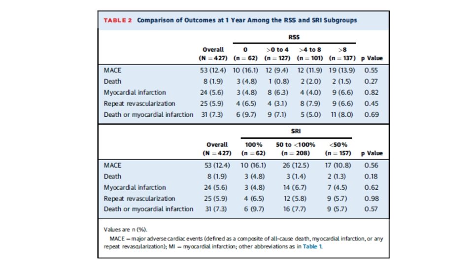 CLINICAL OUTCOMES • MACE at 1 year occurred in 53 patients (12. 4%) • patients with MACE had higher SS and FSS than patients without MACE • RSS and SRI were similar between patients with and without MACE