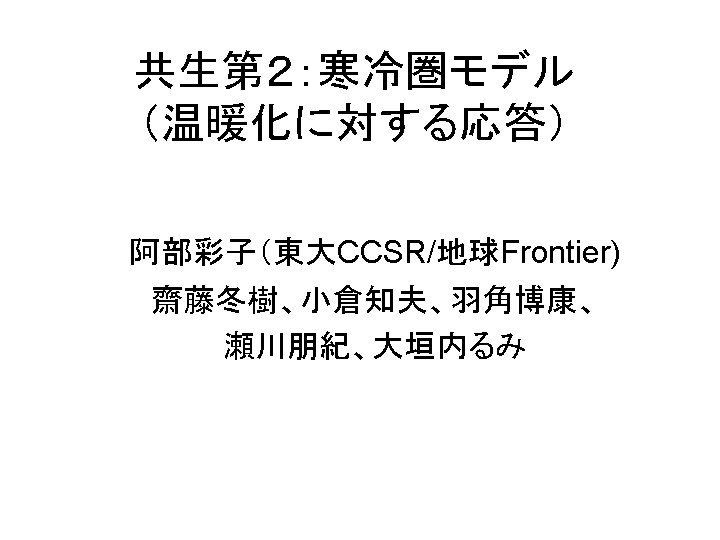 Experimental design: CCSR OAGCM ‘MIROC’ Surface air temperature, humidity Short- Long- Precipiwind velocity wave tation *Atmosphere concentration CCSR/NIES AGCM 5. 6 Skin temperature Resolution: 5. 6° snow *Sea ice snow thickness Thermodynamics: Sea ice Semtner 1976( 0 layer) thickness velocity Hunke and Ducowicz 1997 (EVP rheology) Mixed layer Resolution: 2. 8° velocity *Ocean Resolution: 2. 8° temperature CCSR OGCM’COCO’ 2. 1 Ocean heat transport convergence