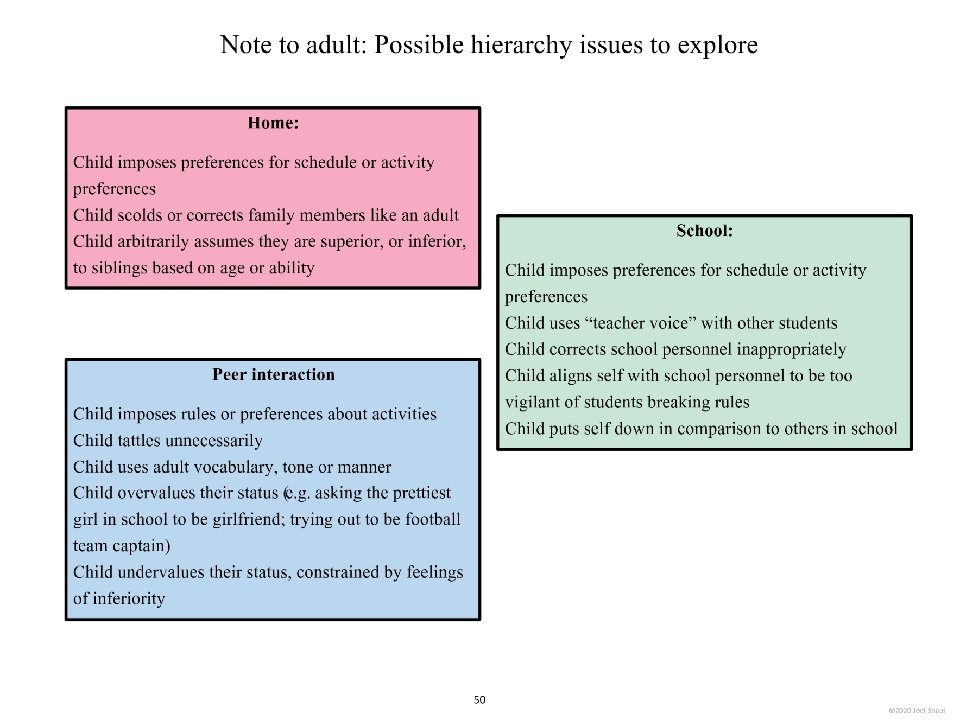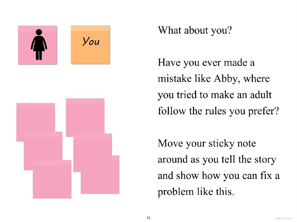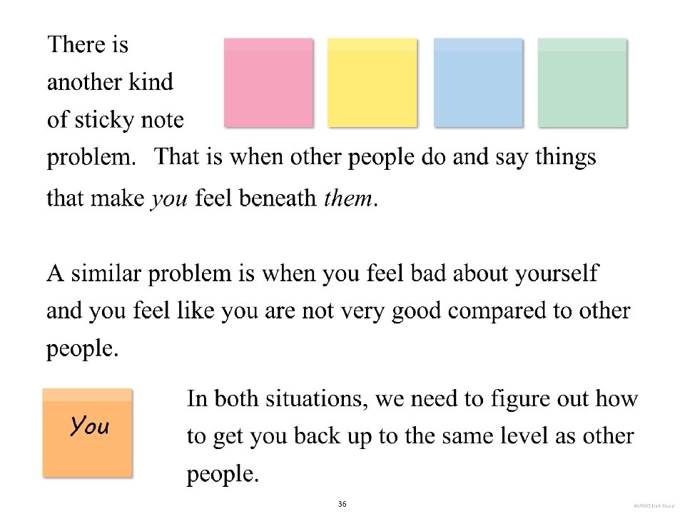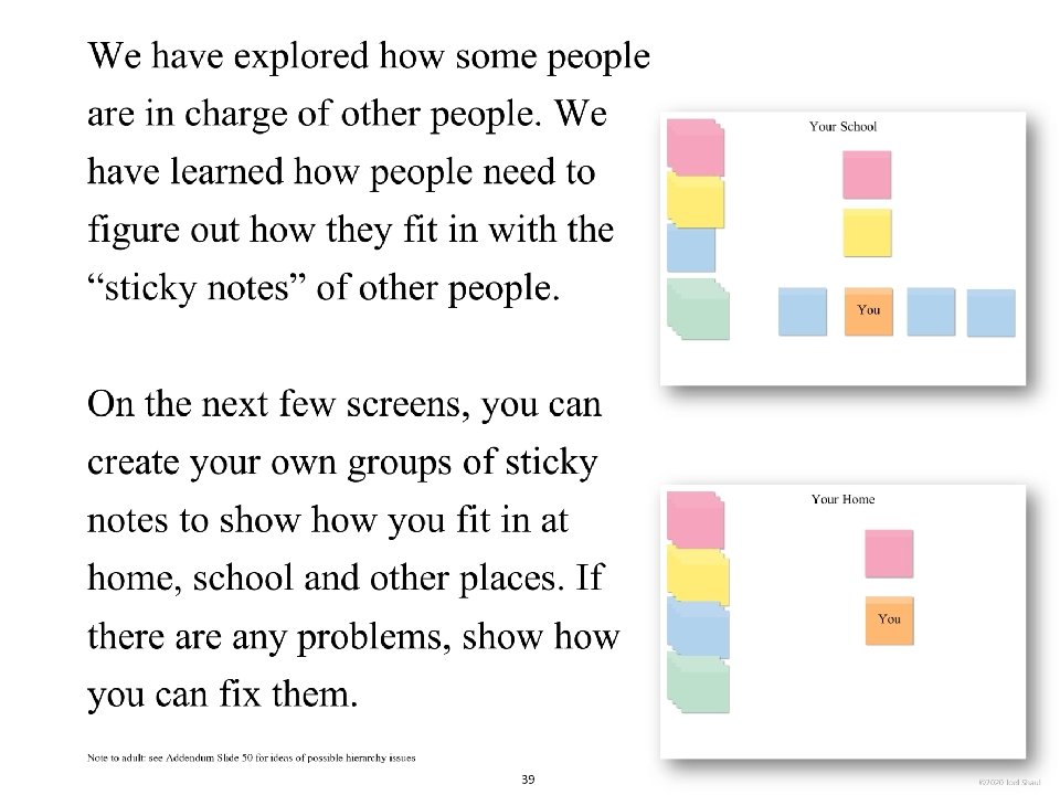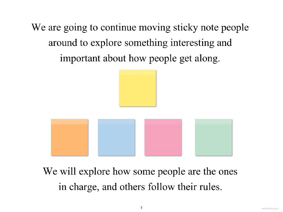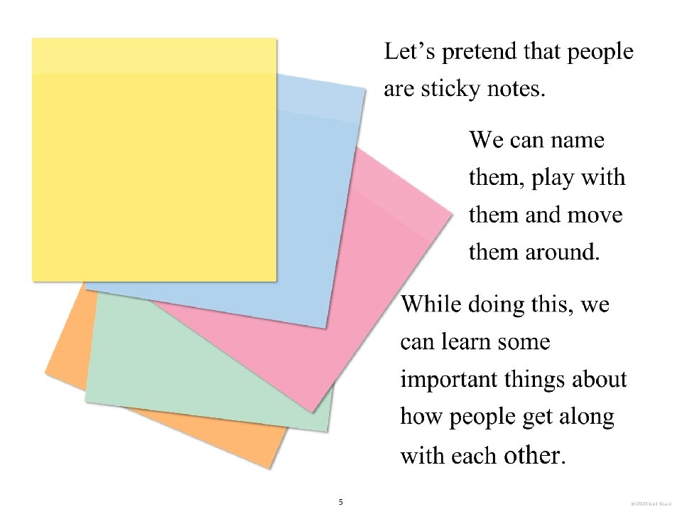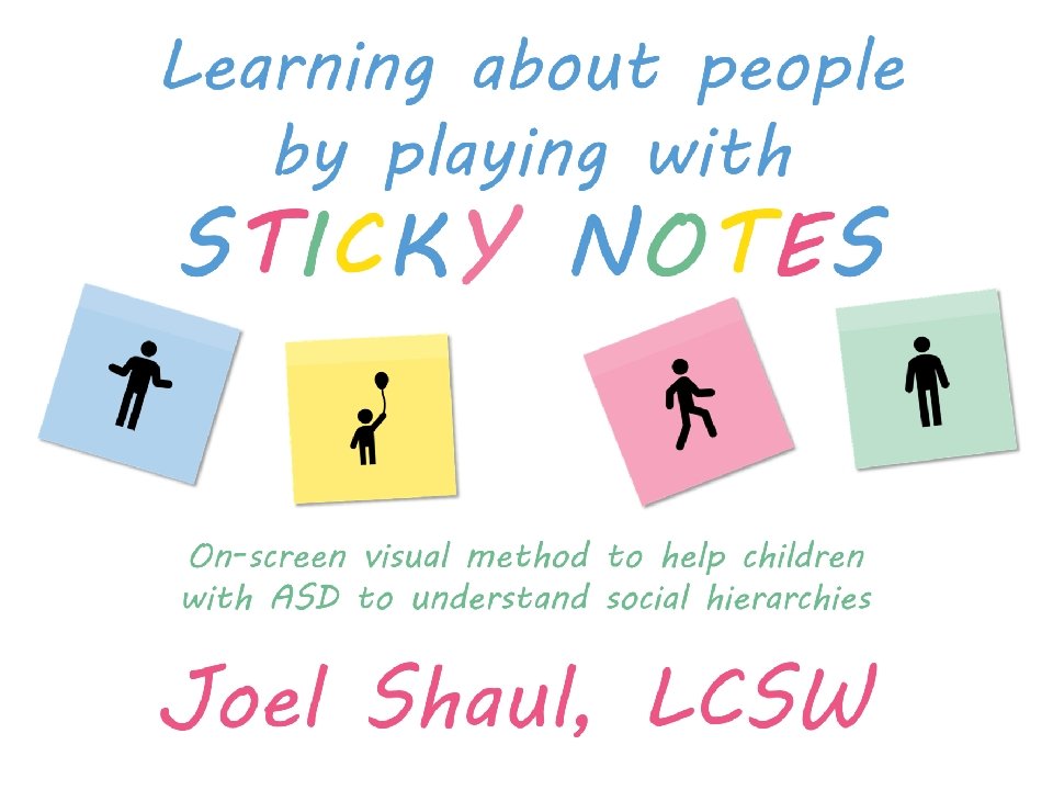 Introduction Children on the autism spectrum often have a lot of difficulty figuring out how they fit in socially within their classrooms, peer groups and families. The subtleties of social ranking can be really confusing. Children with autism often need our help to cut through the intricacies of the various social hierarchies affecting them. *Undervaluing their own essential social value. Children with autism may experience repeated disappointments trying to fit in and be accepted. This can make them feel they are somehow beneath other people and that their fate is to have low social ranking. Ways to use these materials In my own experience working with children in counseling and classroom contexts, I have found it very useful to use hands-on visuals like sticky notes to help increase awareness of the various hierarchies in their lives. Later, I found that this therapy/teaching method works well on a computer screen. I designed Learning about people by playing with sticky notes so that teachers, mental health professionals and parents can try this simple learning method that I have personally found very helpful. I designed this to be a lot like a book, but with moveable parts. Rather than just reading it, pause frequently to move the sticky note images around. Avoid using the big word “hierarchy” unless you are certain that the children understand it. Pay special attention to Part 5, “Figuring out the sticky note problems in your own life. ” This is where you will work closely with children to have them put together sticky note models of various social hierarchies that are giving them trouble. Kids on the spectrum misperceive social hierarchies in different ways and for different reasons. Here are some examples. If you are using these sticky notes resources with children in person, be sure to get out some real sticky notes for breakout activities. They sell very large sticky notes and those are especially nice for drawing on as well as writing. *Failure to acknowledge authority. A child on the spectrum striving to cope with feelings of anxiety might feel compelled to impose their own order on perplexing social situations, effectively putting themselves in charge. I hope that these playful materials help your students and clients with issues they find troubling and confusing. *Failure to return to formality following a period of informality. A child with ASD can become confused when adults are fun and silly but then expect the child to return to the original formal and conventional adult/child relationship. Joel Shaul, LCSW 2 © 2020 Joel Shaul