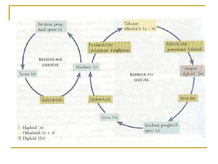 Tiap inti haploid membelah sekali dengan mitosis Askus dengan 8 askospora Jenis jantan Askogonium Trikogin Jenis betina Anteredium Inti haploid jantan Berpindah ke dalam askogonium Hifa dikariotik (n + n) berkembang dari askogonium Meiosis Askus muda Nukleus diploid (2 n) Askokarp terdiri dari hifa dikariotik (n + n) dan hifa steril (n) Reproduksi seksual pada Ascomycota multiseluler