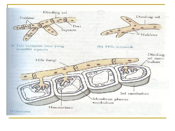 Struktur dan Fungsi Tubuh n n n n Hifa/hifae benang-benang halus Septum/septa sekat / dinding Hifa senositik hifa yg tdk berseptum Miselium/miselia hifa yg bercabang membentuk anyaman Miselium vegetatif menyerap makanan Miselium generatif menghasilkan spora Haustorium/houstoria ujung hifa