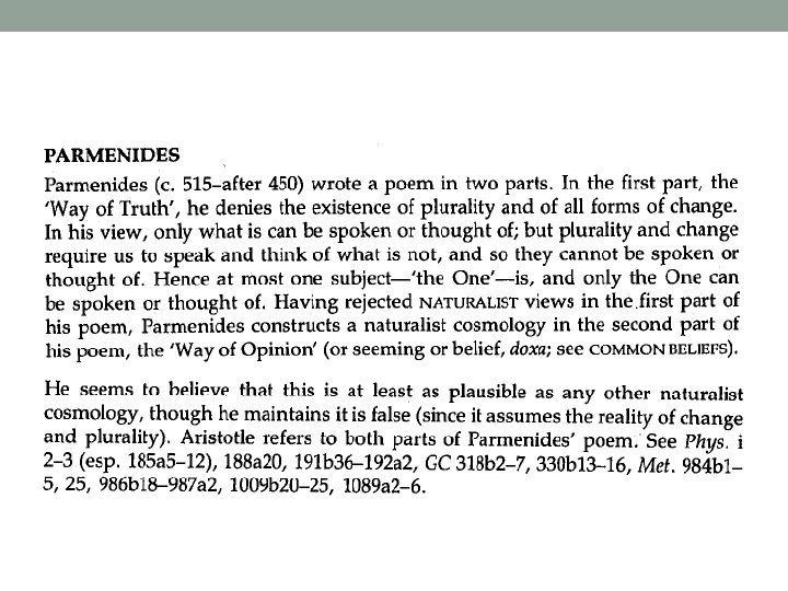 Parmenides on the impossibility of change First part of the argument 1. Change involves the transition from what is not to what it. 2. We can speak and think of change only if we can speak or think of what is not. (from 1) 3. But it is not possible to speak of or think what is not. 4. Therefore, we cannot speak and think of change. Second part of the argument 1. What comes to be must come to be either from what is or from what is not. 2. What is cannot come to be, since it already is. 3. Nothing can come to be from what is not. 4. Therefore, nothing comes to be or perishes. 5. Therefore, there is no plurality, but only being/one itself.
